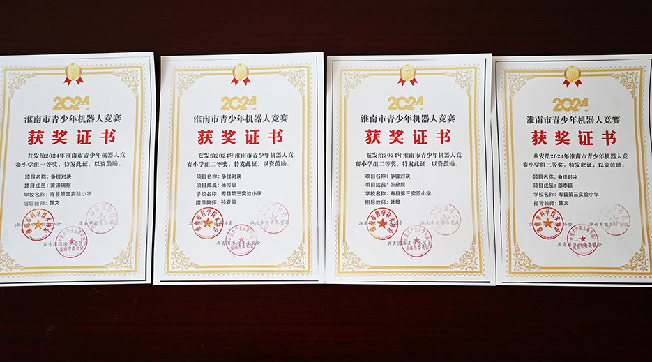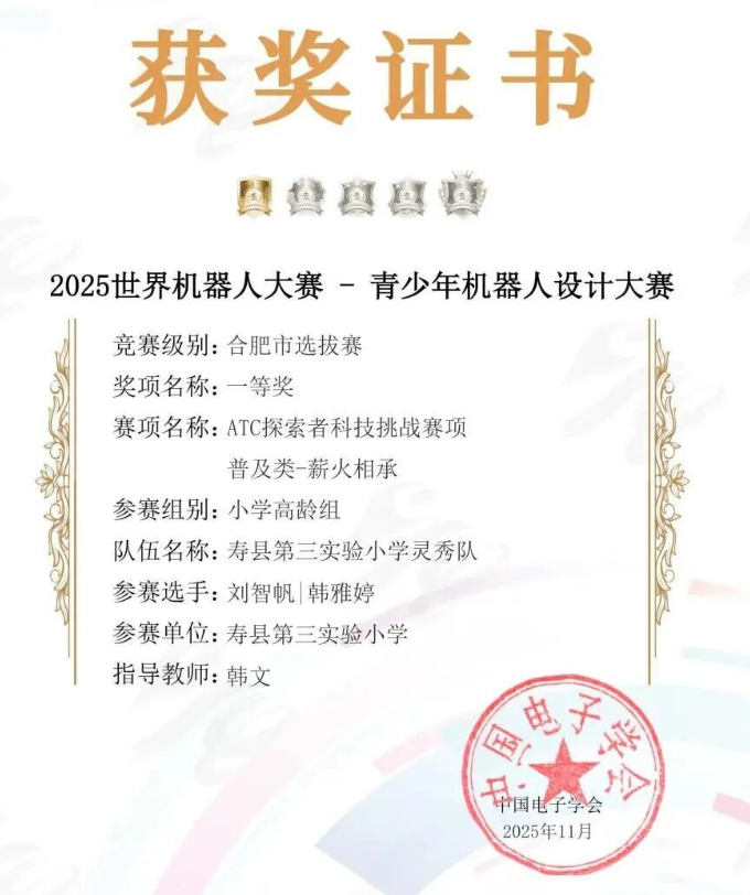 近日,寿县经济开发区县第三实验小学机器人社团,在2025年世界机器人大赛青少年机器人设计大赛合肥市选拔赛上,4支参赛队伍分别获得1个一等奖、3个二等奖。